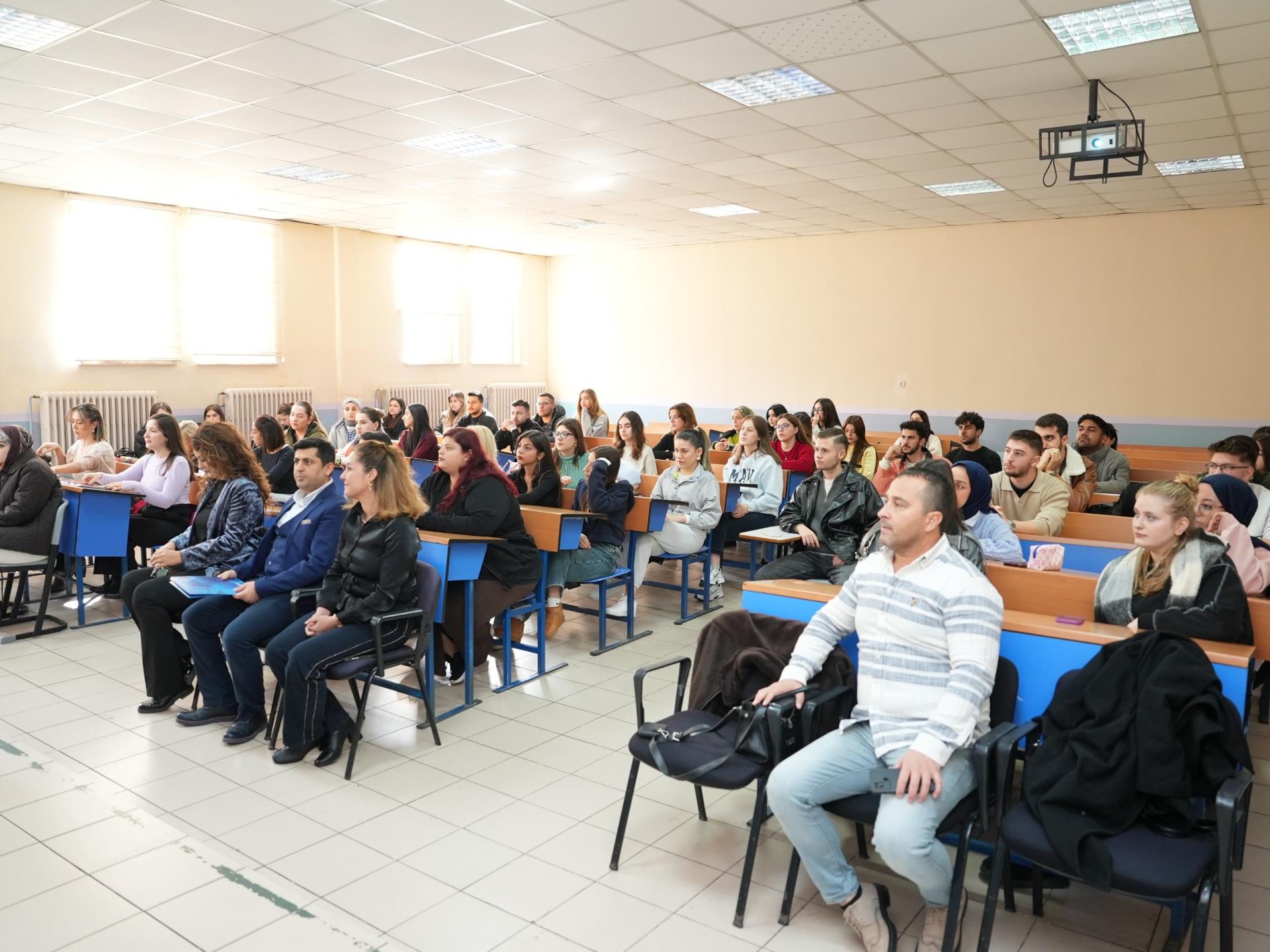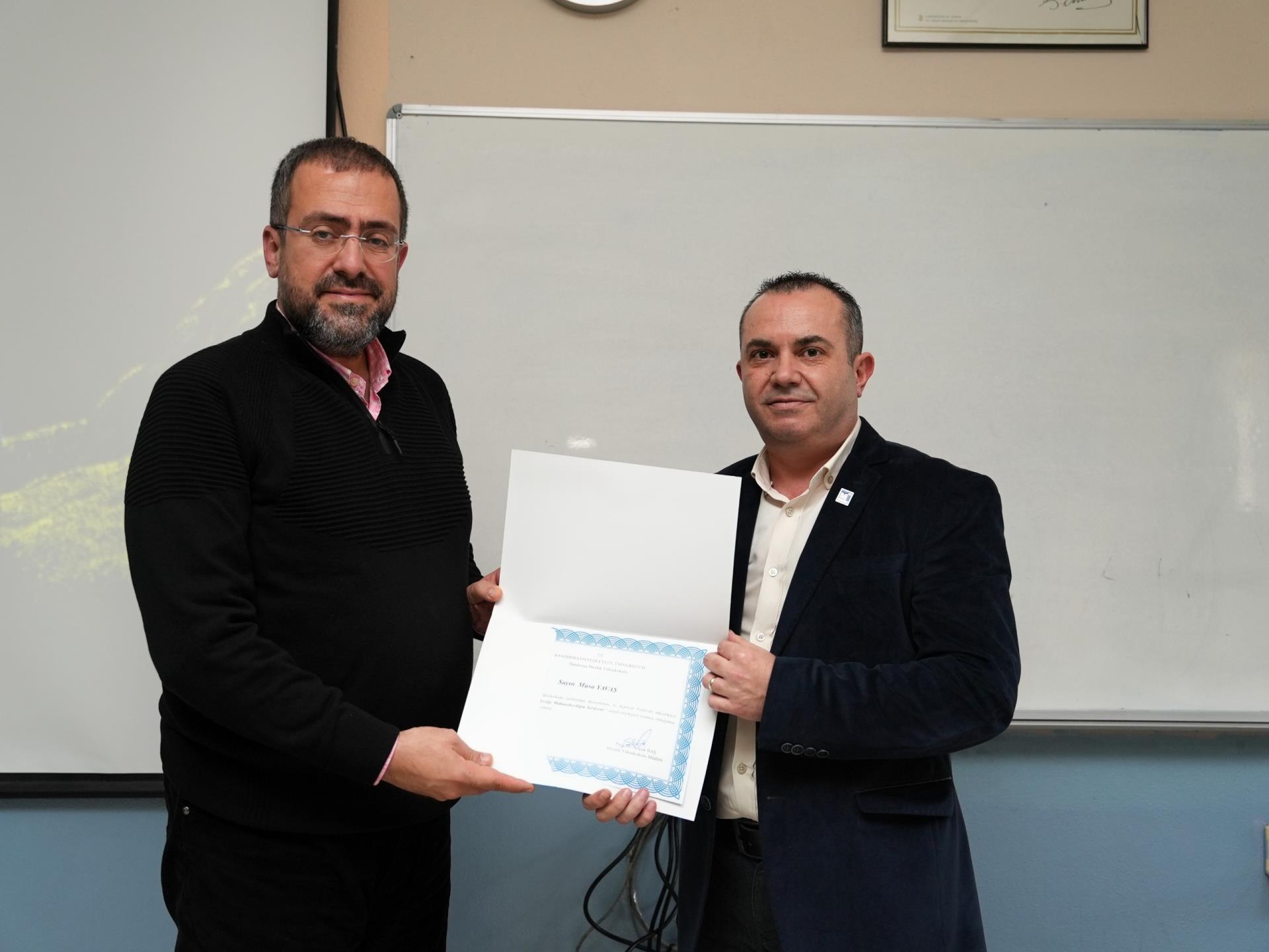 A career planning talk was organized for Accounting and Taxation Department students on December 15, 2025, by Certified Public Accountant Musa YAVAŞ and Gönen City Council President Samet ARIKER. The event, attended by first and second-year students of the Accounting and Taxation Department, featured a presentation by Certified Public Accountant Musa YAVAŞ on the history of accounting from the past to the present. Samet ARIKER provided students with information on what to consider in career planning, employer expectations, working conditions, resume preparation, etc. The talk, which was followed with great interest, concluded with a question-and-answer session. Certificates of appreciation were presented to the participants by Assistant Director Lecturer Burcu CAMGÖZ and Prof. Dr. Mustafa YURTTADUR. At the end of the event, a commemorative photograph was taken with the participants, department faculty members Prof. Dr. Mustafa YURTTADUR, Assoc. Prof. Dr. Nevzat ÇALIŞ, Dr. Lecturer Hatice YALMAN KOŞUNALP, and the students.